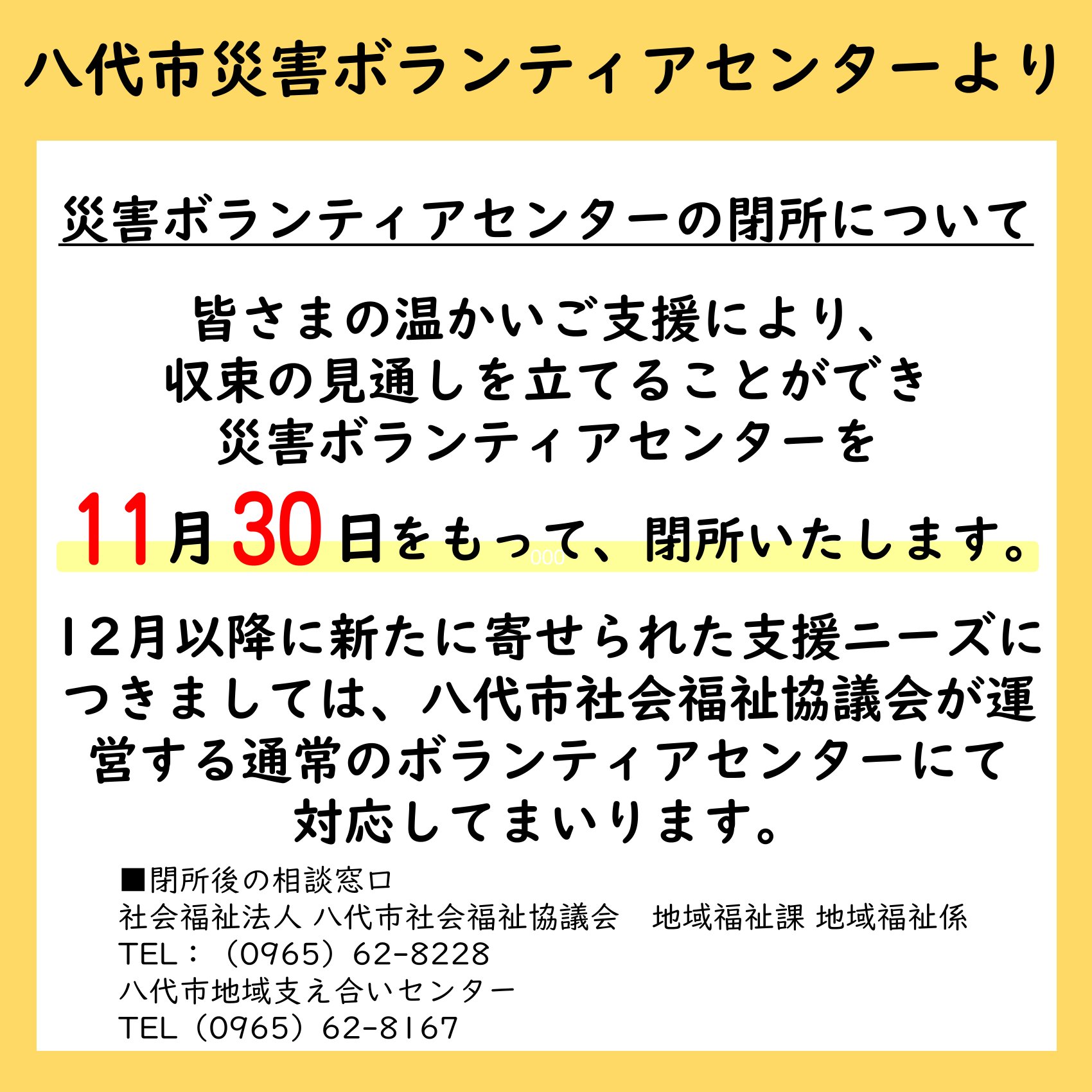 なお、12月以降に新たに寄せられた支援ニーズにつきましては、八代市社会福祉協議会が運営する通常のボランティアセンターにて対応してまいります。