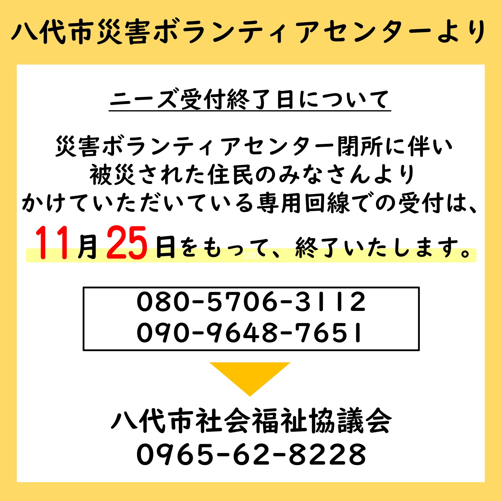 災害ボランティアセンター閉所に伴い、被災された住民の皆さまよりかけていただいている(ボランティアをお願いしたい)080-5706-3112 または 090-9648-7651 での受付を、11月25日(火)をもって終了いたします。